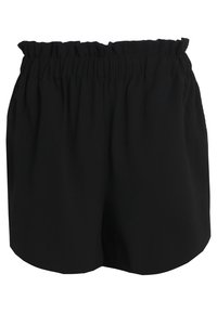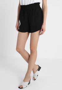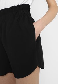 Shorts noirs avec une taille élastique et un cordon de serrage, présentant une coupe large et une texture lisse. Portés avec des talons beiges à bride cheville.