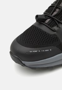 Baskets athlétiques noires et grises avec tige en mesh, lacets élastiques, semelle rembourrée et semelle extérieure texturée sur un fond clair uni.