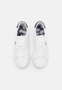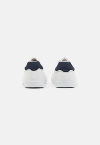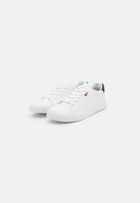 Baskets en cuir blanc à texture lisse, bout rond, lacets à l'avant, avec un accent bleu marine au talon ; elles présentent un petit logo tricolore.