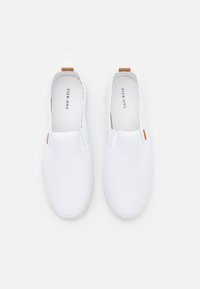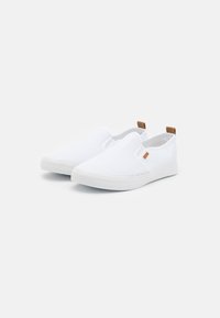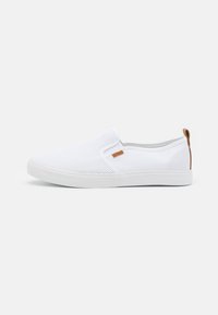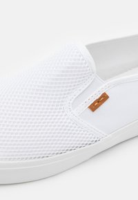 Baskets blanches à enfiler avec tige en mesh, semelle texturée et languette de tirage marron au talon, présentées de profil sur un fond uni.