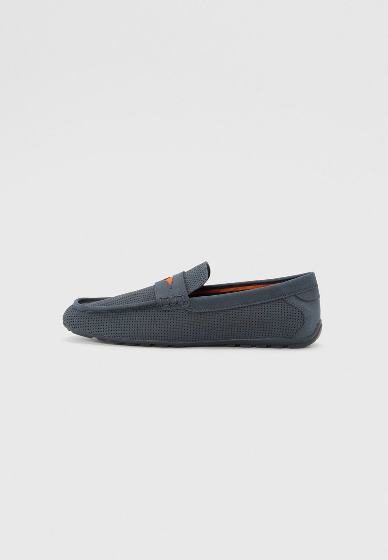 Mocassins gris perforés avec un bout uni, une semelle flexible et un accent orange près du cou-de-pied. Matière textile lisse, design décontracté.