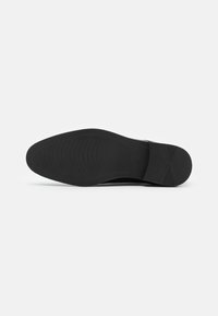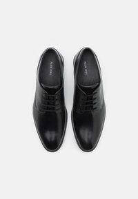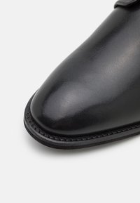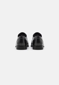 Chaussure de ville en cuir noir avec une finition lisse, un bout rond, cinq œillets pour les lacets et un petit talon en caoutchouc. Design minimaliste sans embellissements.