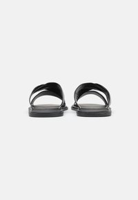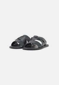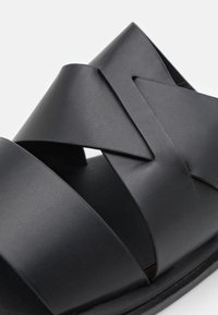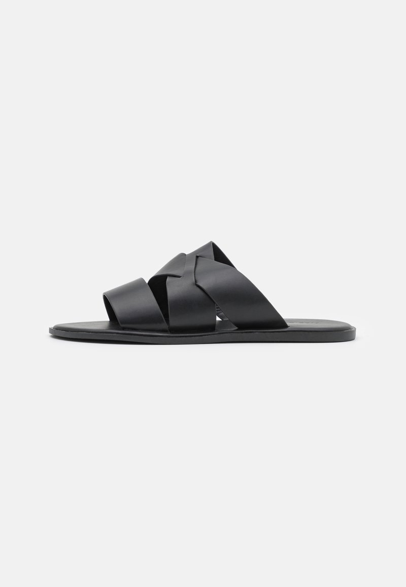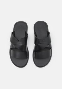 Sandales noires à semelle plate, dotées de trois larges sangles entrecroisées en matériau lisse. Design minimaliste avec une apparence épurée.