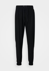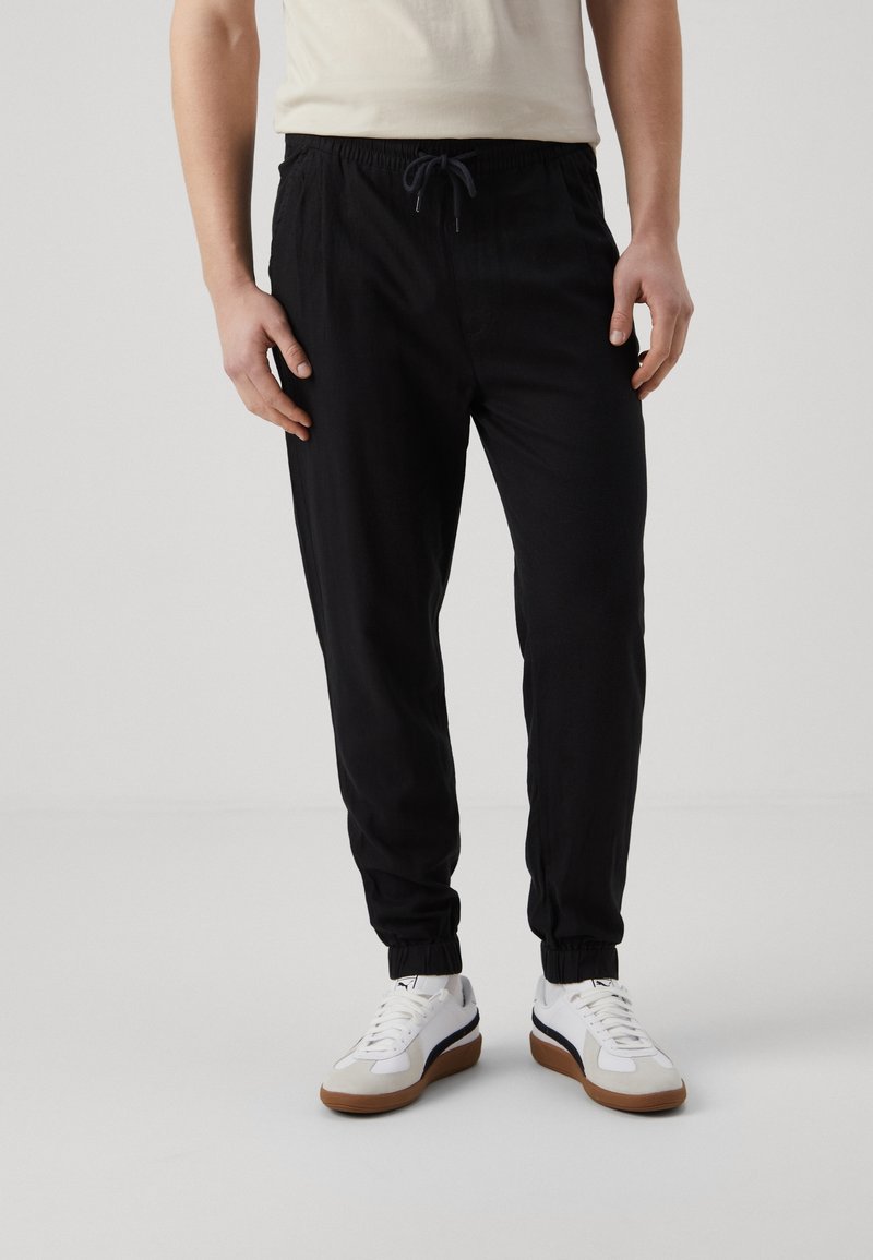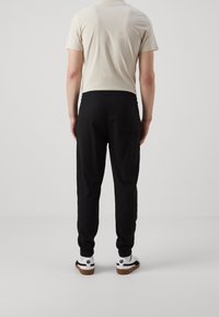 Homme portant un pantalon de jogging noir avec des poignets élastiques, des baskets blanches aux semelles brunes, debout sur un fond clair uni.