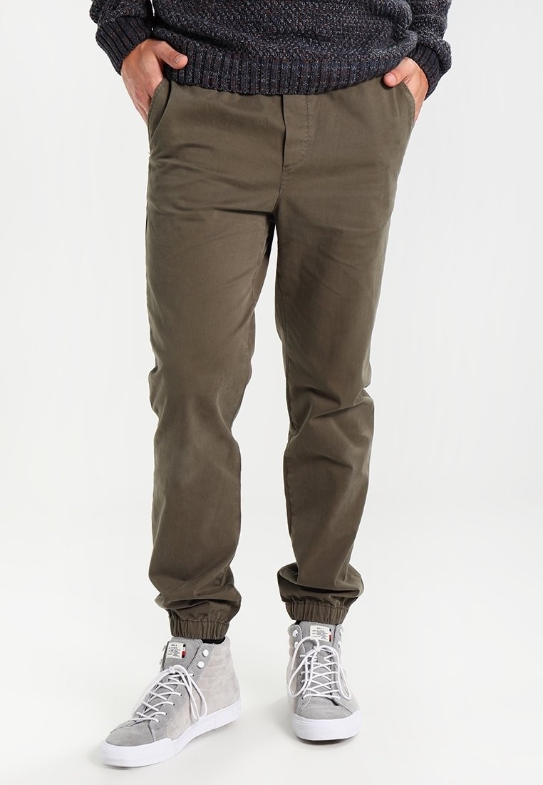 Homme portant un pantalon de jogging vert olive avec des poignets élastiques, des baskets montantes grises et un pull texturé foncé avec les mains dans les poches.