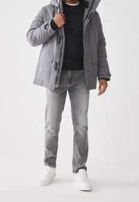 Homme portant une veste d'hiver à capuche grise par-dessus un pull noir et un jean gris, ajustant la veste près de la fermeture éclair.