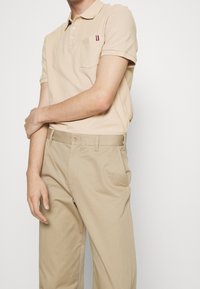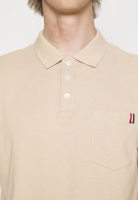 Polo beige en coton, avec col, manches courtes, poche poitrine et une petite bande d'accent rouge, blanc et bleu.