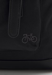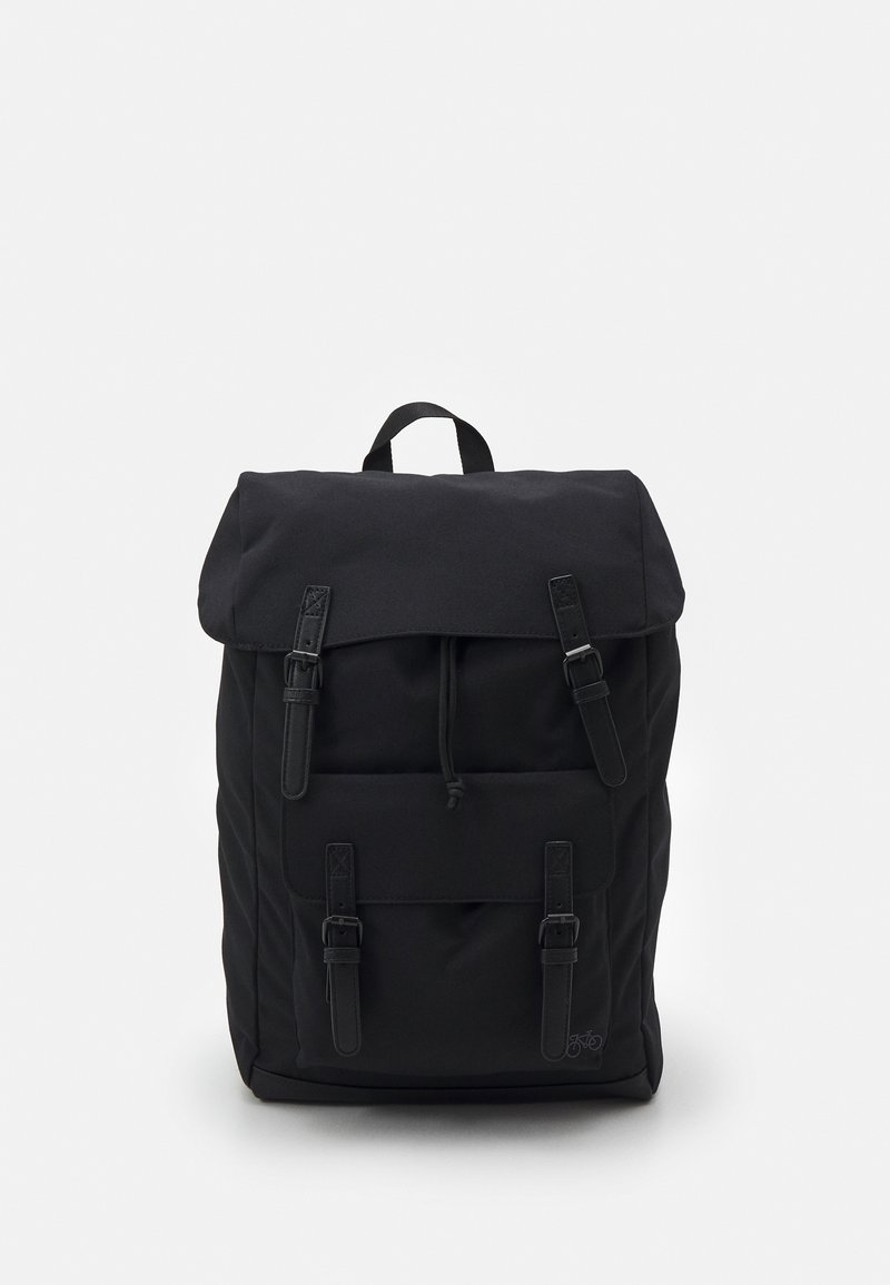 Sac à dos noir avec rabat supérieur et quatre sangles à boucle, doté d'une poche frontale et d'un petit logo de bicyclette dans le coin inférieur droit.