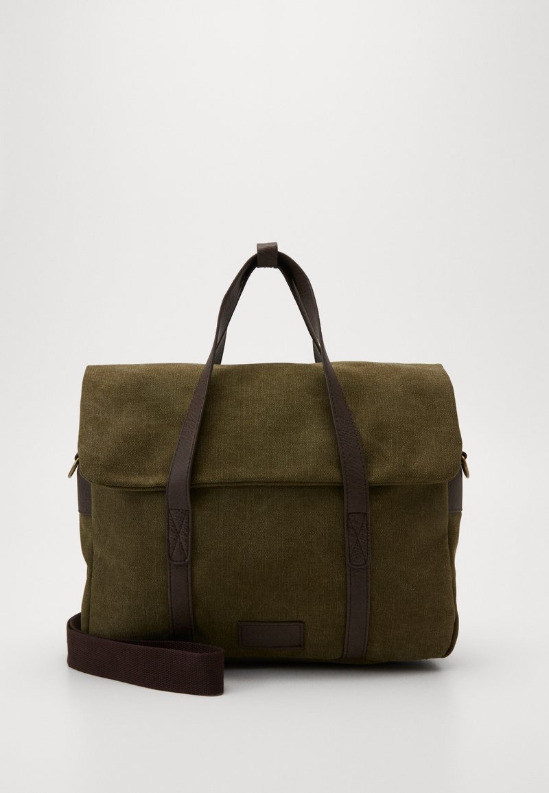 Sac en toile vert olive avec accents en cuir marron, double poignées courtes et bandoulière détachable ; forme rectangulaire avec fermeture à rabat.
