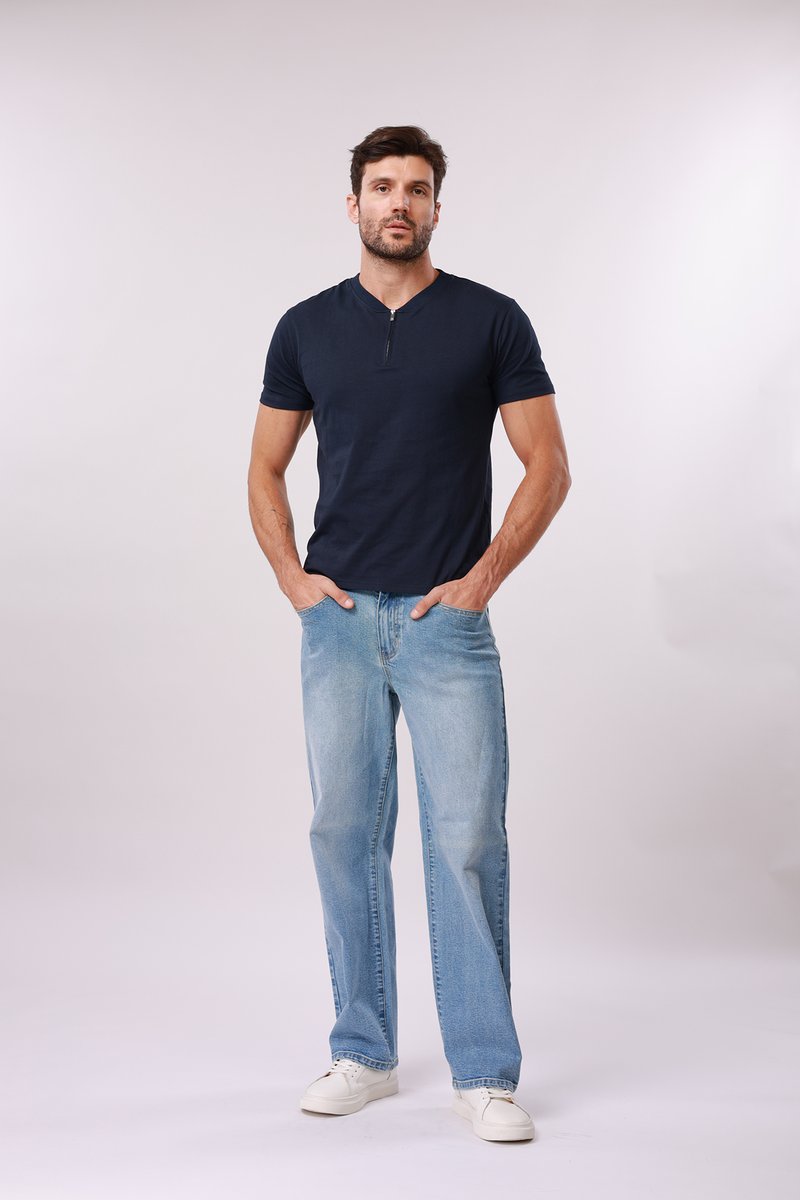 Homme debout, les mains dans les poches, portant une chemise bleu marine à manches courtes, un jean bleu clair et des baskets blanches sur un fond uni.
