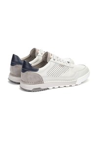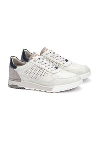 Baskets en cuir blanc et gris avec panneau latéral perforé, lacets blancs, semelle rembourrée et accent noir au talon, présentées sur fond blanc.
