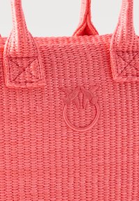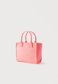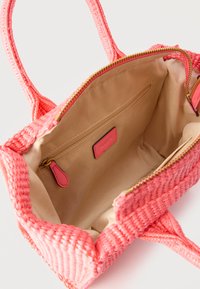 Sac à main tissé rose avec deux anses et un emblème floral circulaire à l'avant, sur fond blanc uni.