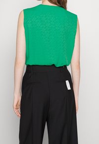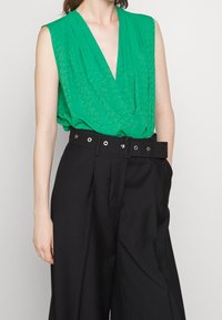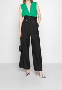 Blouse verte sans manches avec un motif subtil, rentrée dans un pantalon noir taille haute à jambes larges, ceinturé d'une large ceinture noire.