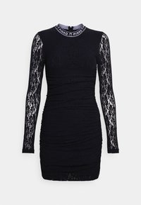 Robe moulante en dentelle noire avec de longues manches transparentes à motifs floraux et un col montant avec logo.