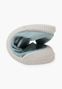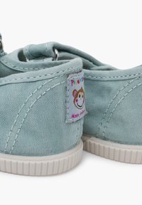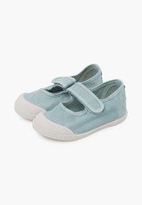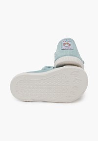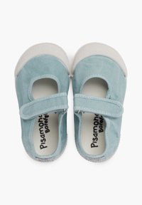 Chaussure pour enfant en tissu bleu clair avec une coque d'orteil en caoutchouc blanche, une semelle blanche et une seule bride Velcro sur le dessus.