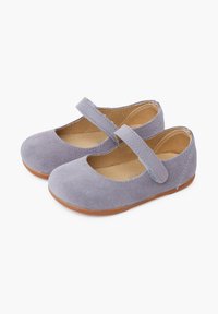 Chaussure Mary Jane en daim gris avec une bride unique et une semelle en caoutchouc marron, vue de côté sur fond blanc.