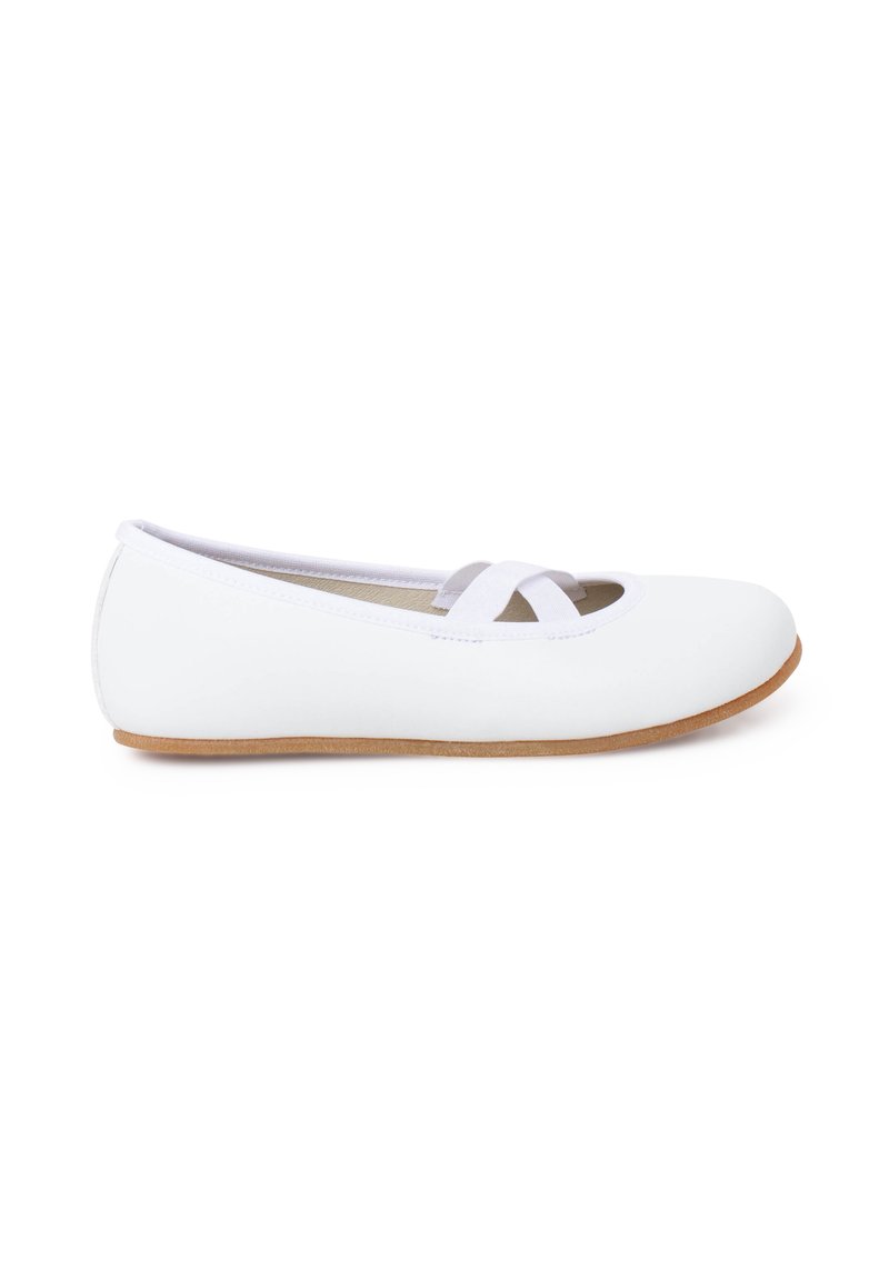 Chaussure de ballet plate blanche avec des brides élastiques croisées et une semelle marron clair, vue de profil sur un fond blanc.