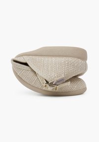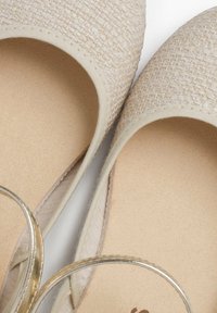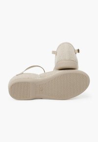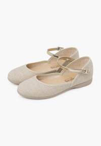 Chaussure plate beige avec un dessus en tissu texturé, une sangle de cheville avec une boucle, un bout rond et une semelle basse et robuste.
