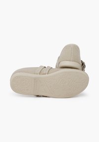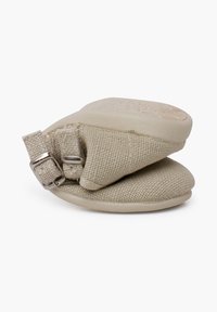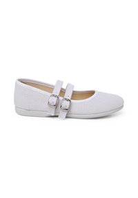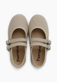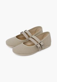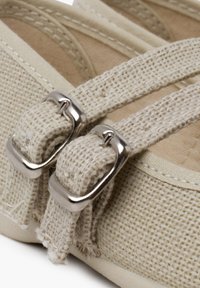 Chaussure Mary Jane beige texturée avec deux boucles argentées réglables et une semelle plate, vue de côté sur fond blanc.