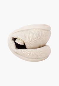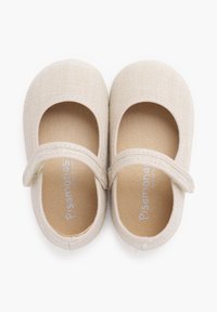 Chaussure Mary Jane en tissu beige avec une bride à scratch et une semelle souple, conçue pour un usage décontracté.