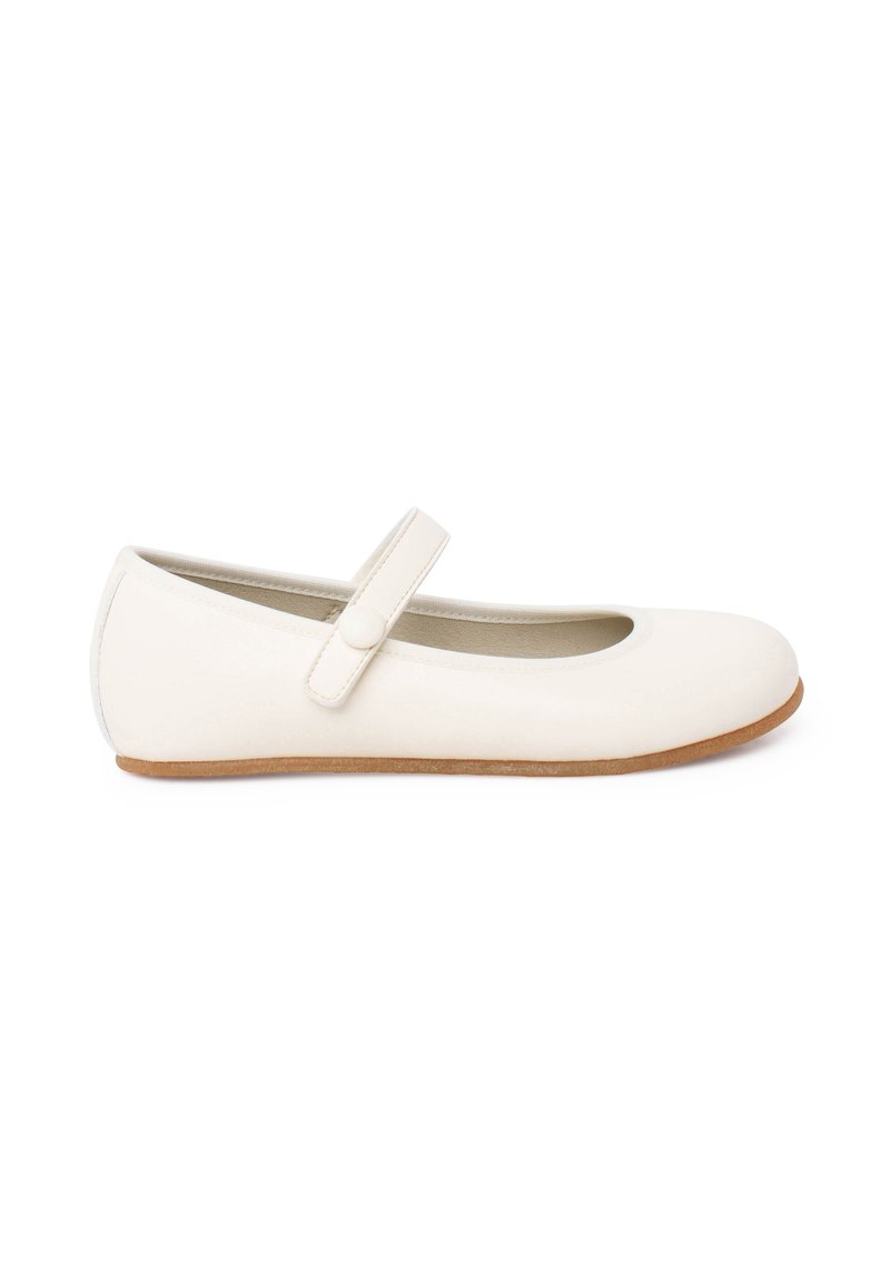 Chaussure plate Mary Jane blanche avec une seule lanière boutonnée et une semelle marron clair, présentée de profil sur fond blanc.