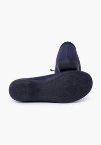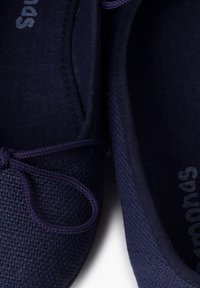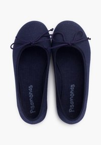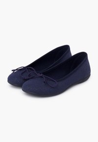 Ballerine bleu marine en tissu texturé, avec un détail en nœud au niveau des orteils et une semelle en caoutchouc basse pour un confort optimal.