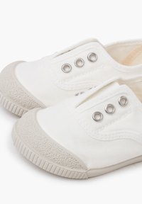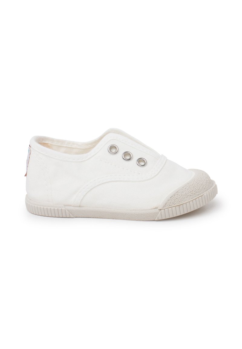 Chaussure blanche basse en toile sans lacets avec trois œillets en métal et embout ainsi que semelle en caoutchouc texturé, vue de côté sur fond blanc.