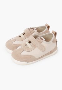 Baskets beige pour tout-petit en daim et tissu mesh, une bride Velcro unique, une languette au talon et une semelle en caoutchouc blanche.