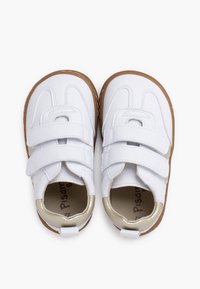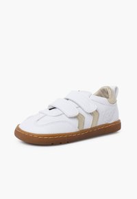 Baskets blanches en cuir avec accents dorés et deux fermetures Velcro. Elles présentent une semelle en caoutchouc marron et un motif texturé sur le bout.
