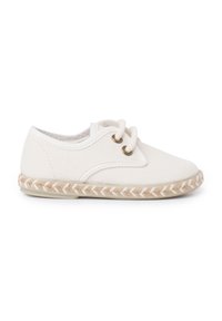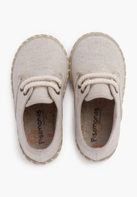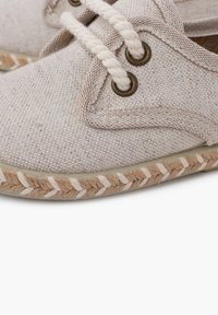 Chaussure en toile beige à bout rond, avec des coutures décoratives et deux œillets. Elle possède une semelle en jute tressé pour une texture et des détails supplémentaires.