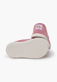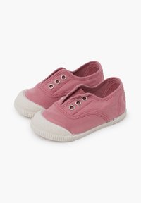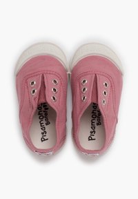Chaussure en toile rose à enfiler avec semelle en caoutchouc et bout renforcé, dotée de trois œillets métalliques et de détails de coutures visibles.