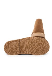Bottine en daim marron avec un bout rond, deux œillets et une semelle en caoutchouc contrastante. Comprend des détails cousus le long du bord.