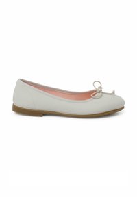 Ballerines en matériau synthétique gris clair avec un bout arrondi, un petit nœud décoratif à l'avant et une semelle en caoutchouc beige.