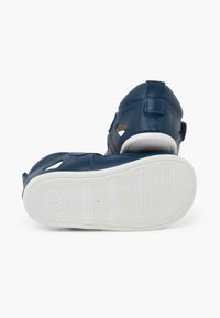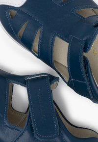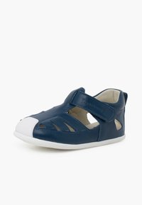 Sandale en cuir bleu marine avec un design découpé, bande velcro, capuchon en caoutchouc blanc sur les orteils et semelle blanche. Convient pour un usage décontracté.