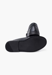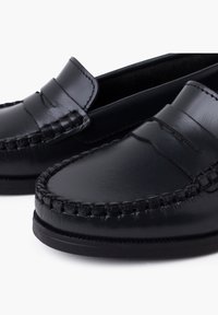 Mocassins en cuir noir avec un détail de couture, bout arrondi, semelle en caoutchouc basse et design à enfiler. Texture lisse et style minimaliste.