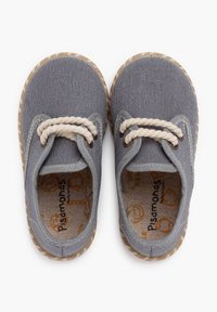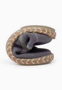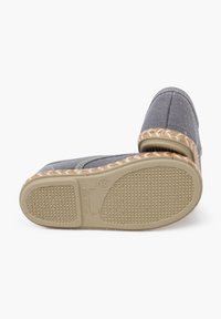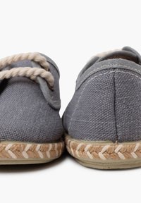 Chaussure en toile grise avec des coutures et des lacets beiges, présentant un bout rond et une semelle en jute tressé. Le design comprend des œillets.