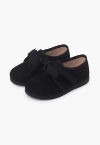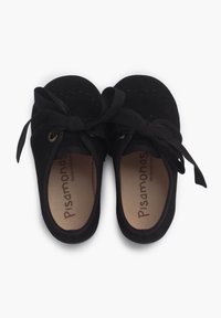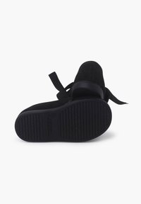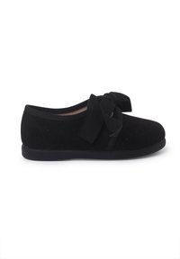 Ballerines en daim noir à la texture douce, avec un nœud décoratif à l'avant et une semelle noire flexible. Design simple et élégant.