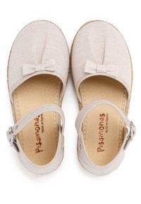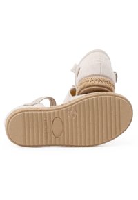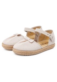 Espadrille beige clair avec une tige en tissu, bride de cheville réglable et un nœud décoratif sur les orteils. Semelle en jute.