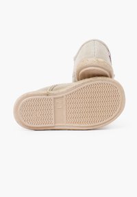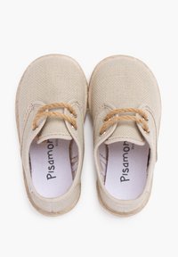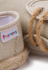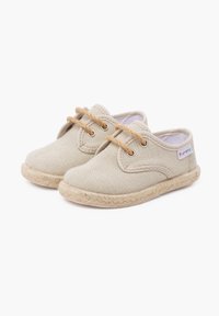 Chaussures pour enfants en toile beige avec une surface texturée, bout rond, fermeture à lacets décorative et semelle en jute tressé. Comprend une petite étiquette avec logo.