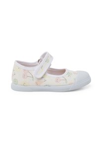 Chaussure Mary Jane blanche en tissu avec un col doux et rembourré, une sangle réglable et un motif de fruits pastel sur le dessus. Semelle en caoutchouc.