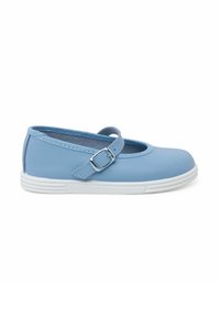 Chaussure Mary Jane beige avec un bout arrondi, une seule bride ajustable et une semelle en caoutchouc blanc, présentant un dessus synthétique lisse et une doublure douce.