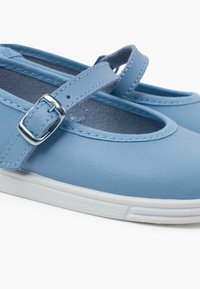 Chaussure Mary Jane en cuir bleu clair avec un bout rond, semelle en caoutchouc blanche et bride adjustable avec une boucle en argent.