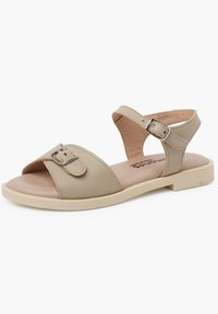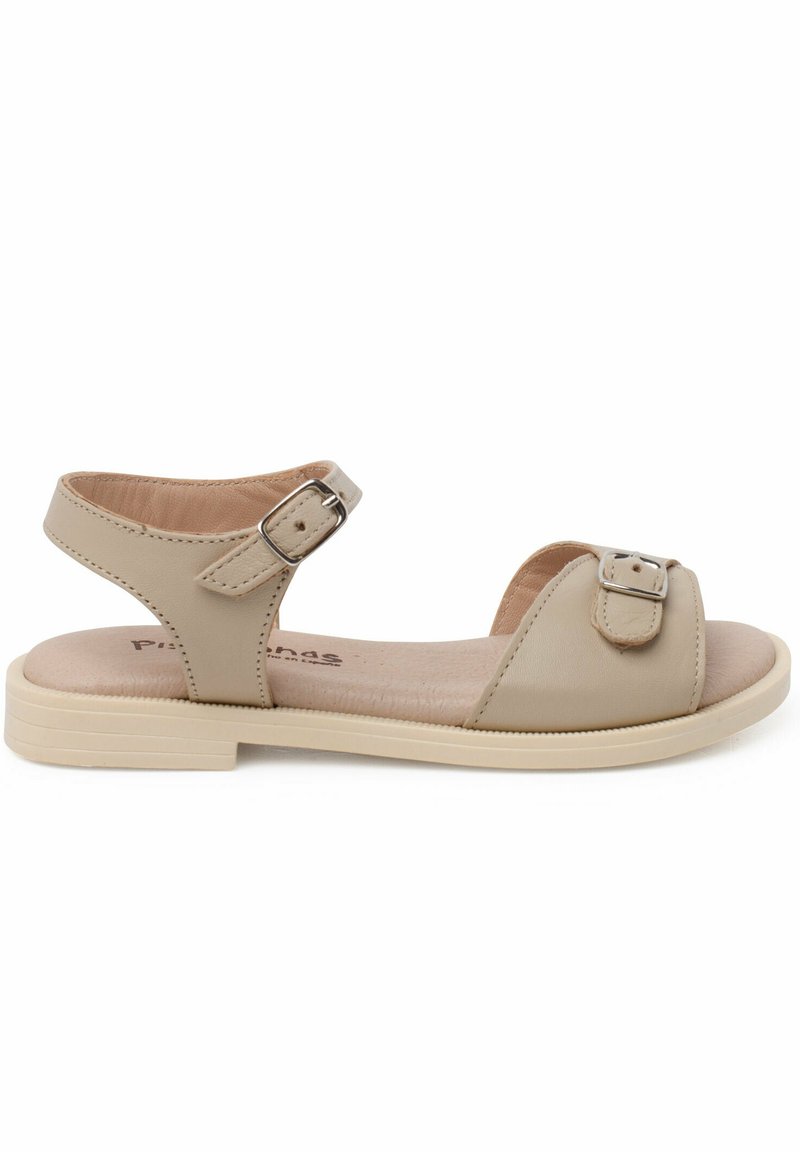 Sandale en cuir beige avec une semelle plate, une bride de cheville ajustable et une boucle décorative sur le côté. Texture lisse, design minimaliste.