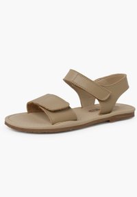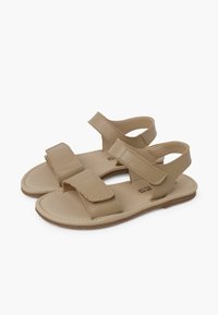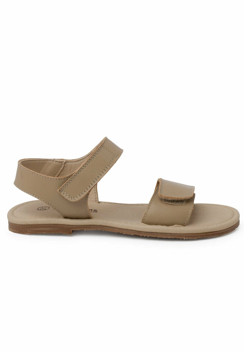 Sandal en cuir tan avec deux sangles à boucle auto-agrippante, semelle plate et design minimaliste. La semelle intérieure est rembourrée pour un confort supplémentaire.