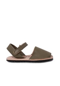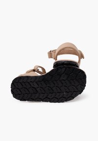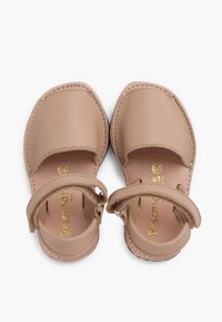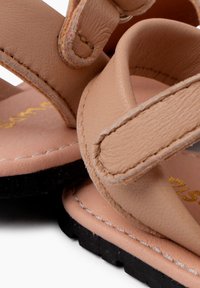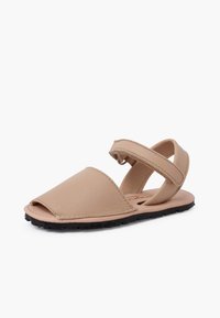 Sandale en cuir tan avec un design minimaliste, bout ouvert et sangle réglable, dotée d'une semelle en caoutchouc noir et de détails de couture visibles.