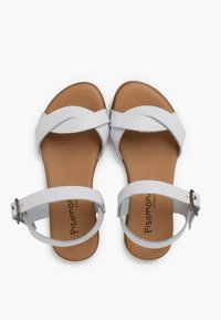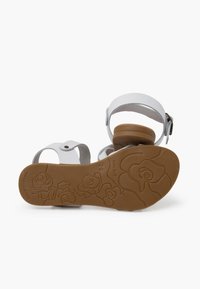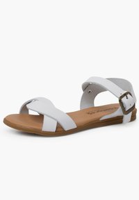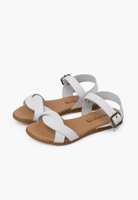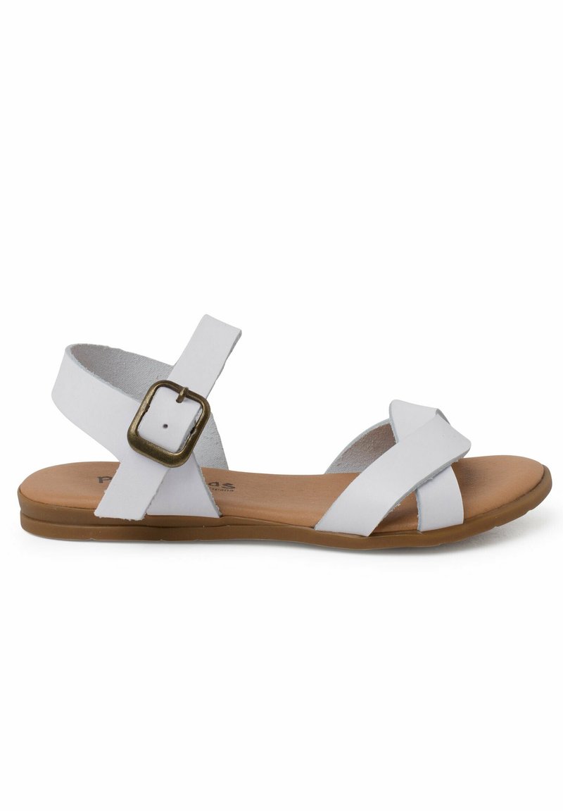 Sandales en cuir blanc avec des brides croisées et un détail de boucle. Semelle plate avec un pied en brun. Design ouvert pour la respirabilité.