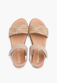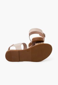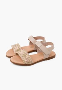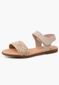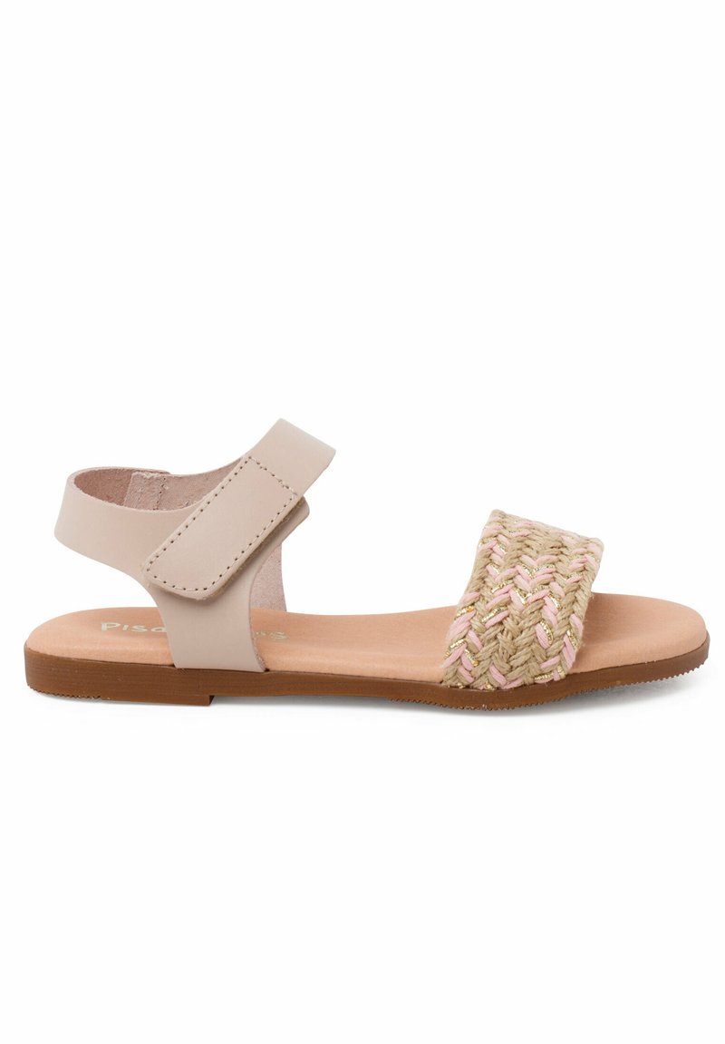 Sandales plates beiges avec une sangle en fibre naturelle tressée, des accents roses et une fermeture de sangle pâle. Semelle intérieure douce et semelle extérieure en caoutchouc.