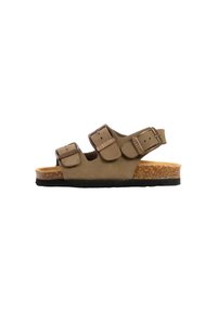 Sandale marron avec semelle en liège et trois brides réglables avec boucles métalliques, vue de profil.