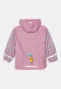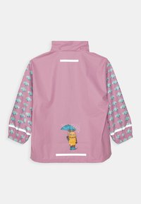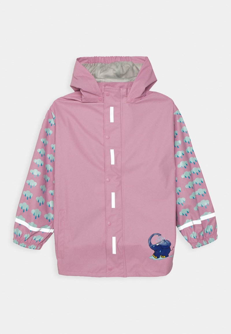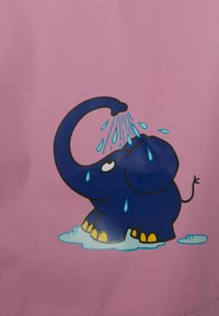 Veste de pluie rose avec capuche, ornée de motifs d'éléphants bleus sur les manches, de bandes réfléchissantes blanches et d'un détail de cartoon d'éléphant sur le devant.