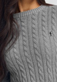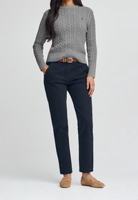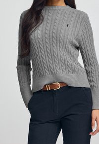 Pull gris en maille torsadée avec ourlet et poignets côtelés, associé à un pantalon bleu marine et une ceinture marron avec une boucle dorée.